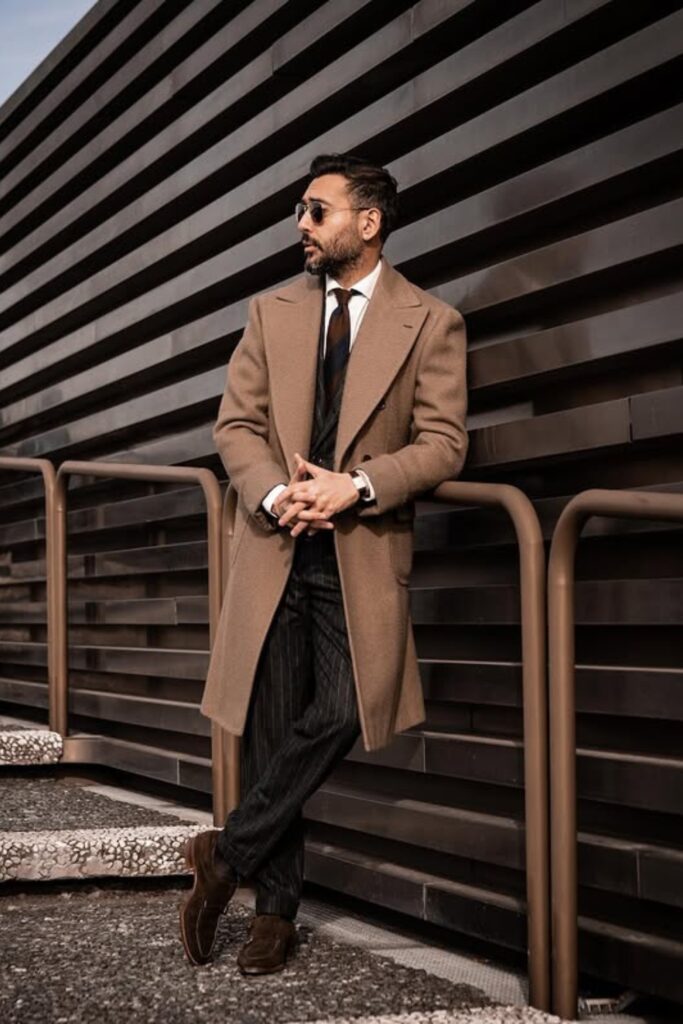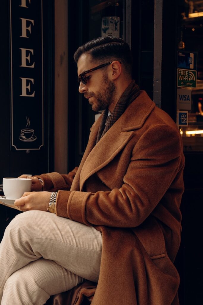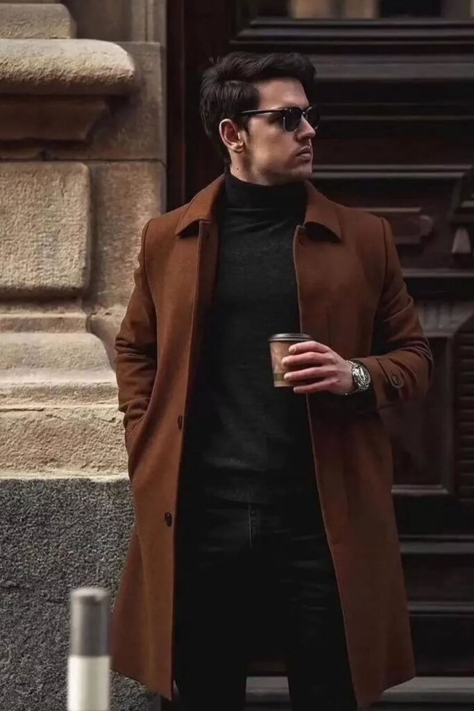 A structured brown overcoat gives off that movie gentleman vibe right away, and strong outerwear typically makes the whole look.