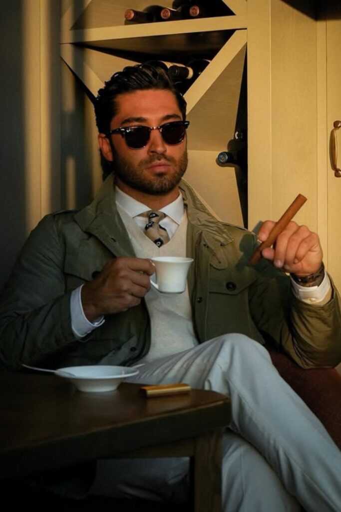 Sunglasses and a cigar give off an old-fashioned movie vibe that goes with classic Italian clothes and timeless gentlemen flair.