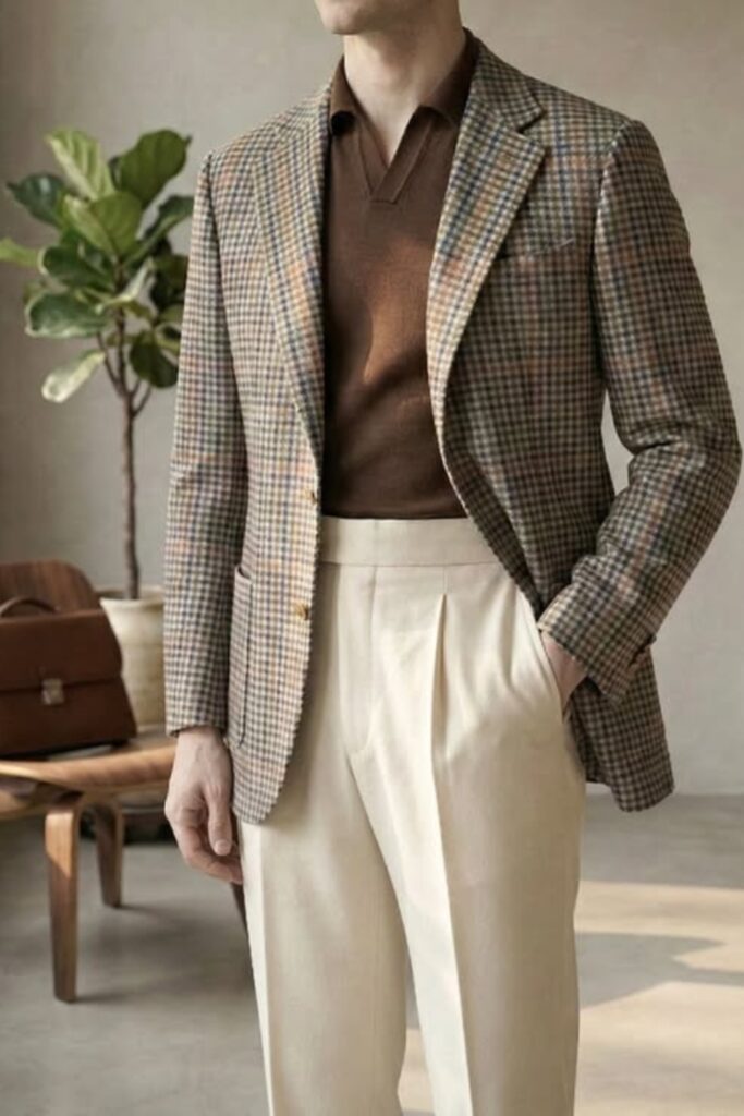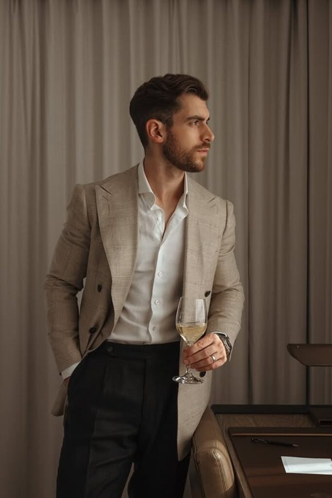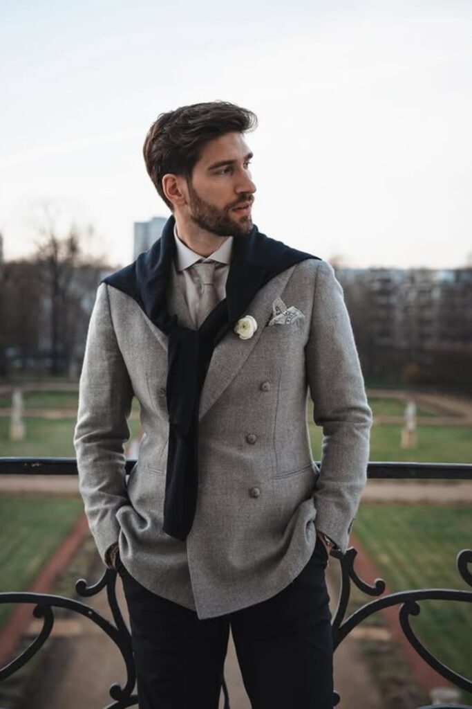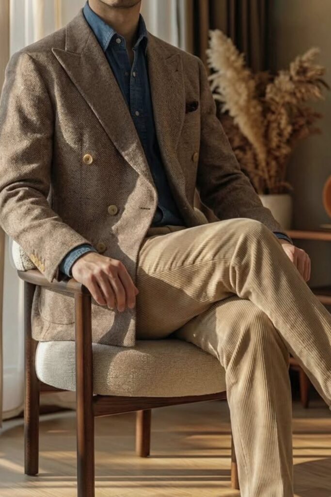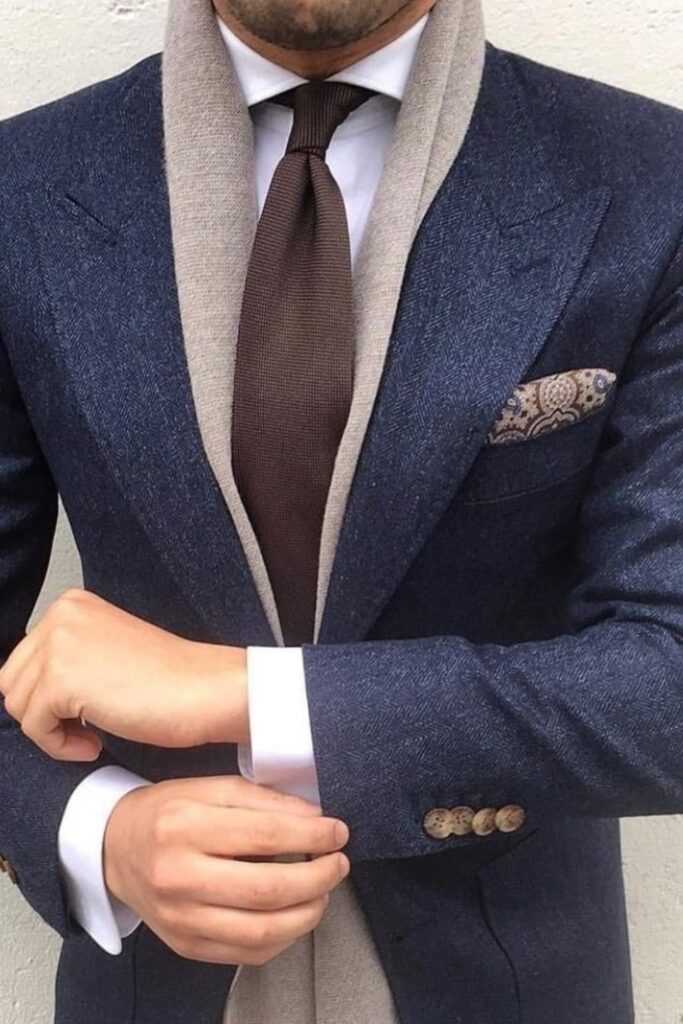 The pocket square gives the outfit a little personality, and the layered fabrics add depth, which is something that classic men’s clothing often does.