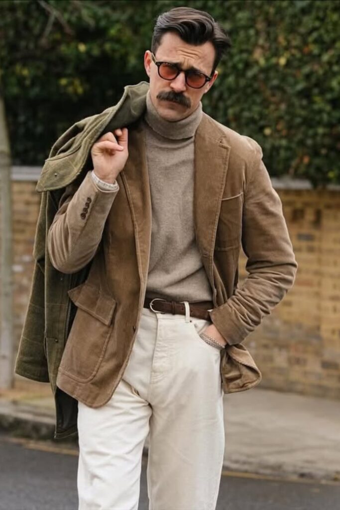 Warm earth tones usually seem organically retro, especially when you wear a corduroy blazer with a soft turtleneck and light pants.