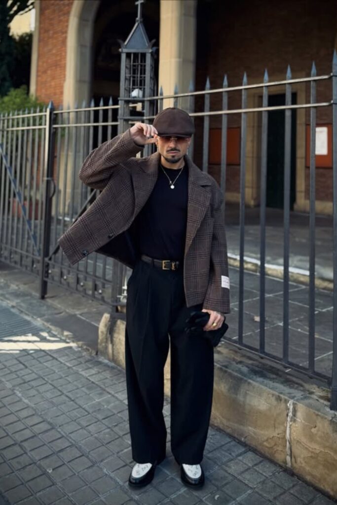 A traditional flat cap is one of the most important accessories for vintage men’s clothes, especially when worn with a patterned blazer and loose-fitting.