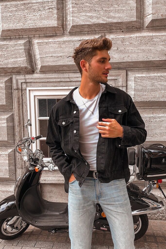 A black denim jacket and light blue jeans provide an easy retro street look that starts with classic elements.