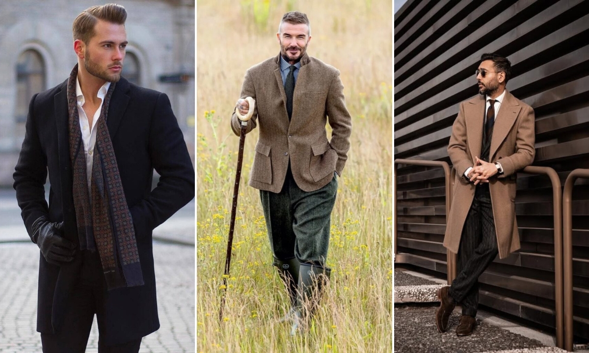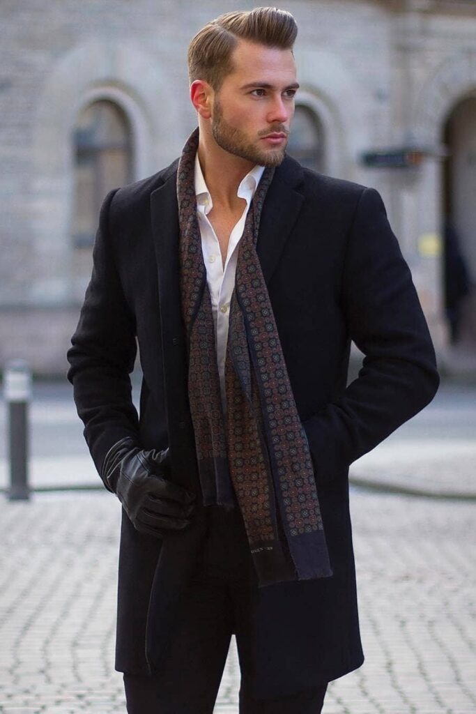 Strong layers are typically used in historical clothes for cold weather. A structured overcoat and a patterned scarf together give off that classy.