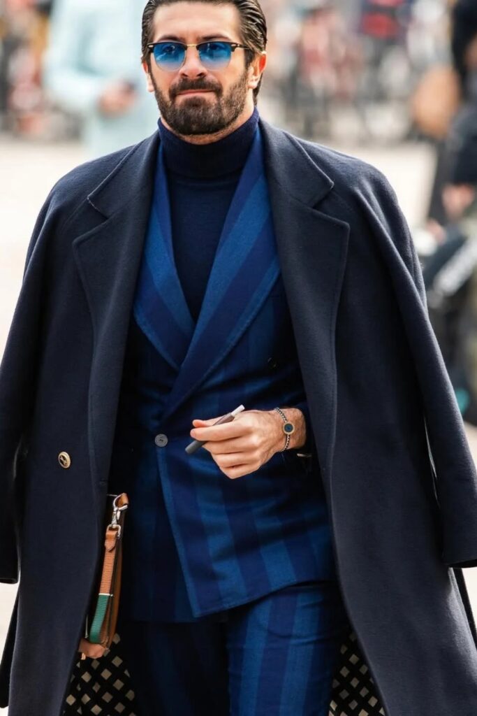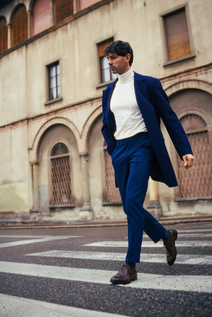 Some old-fashioned clothes have great tailoring, and a deep navy double-breasted suit with a turtleneck on top is a classic European men’s look.