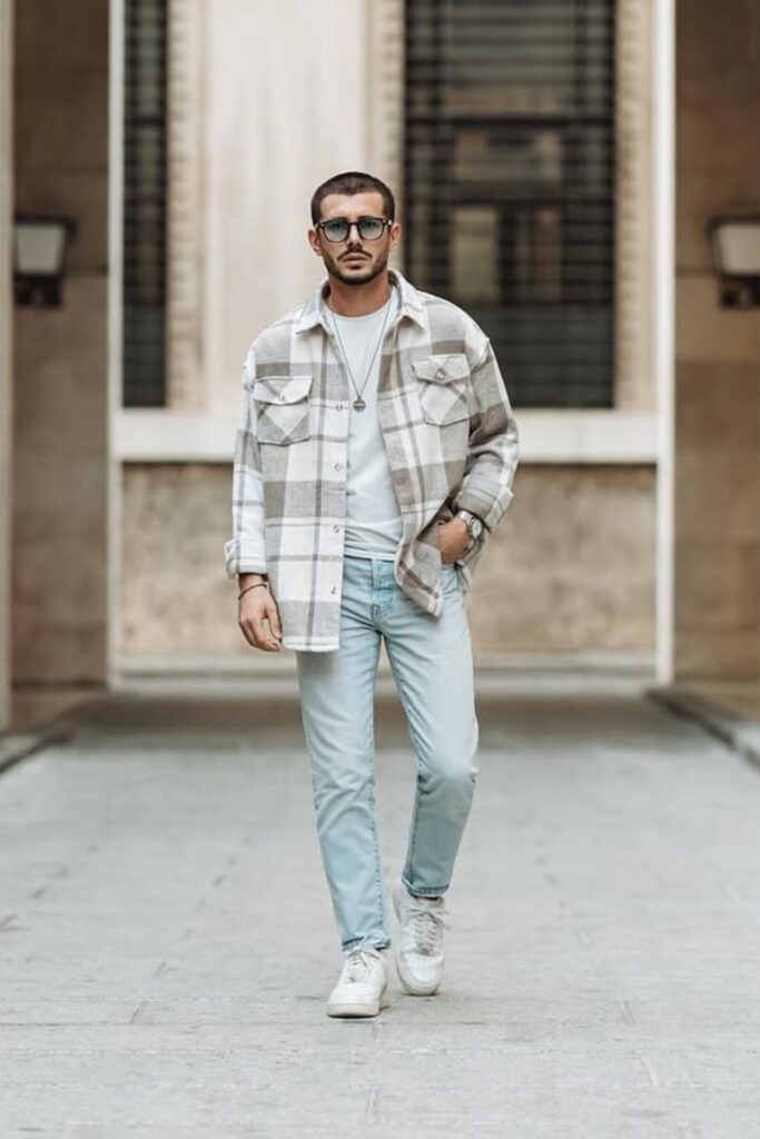 A big plaid overshirt over light denim is an easy way to get a retro look with vintage casual clothes.