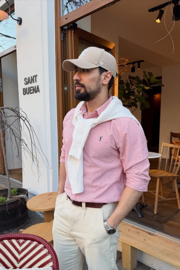 The baseball cap keeps the look informal and modern, while the sweater draped over the shoulders adds depth.