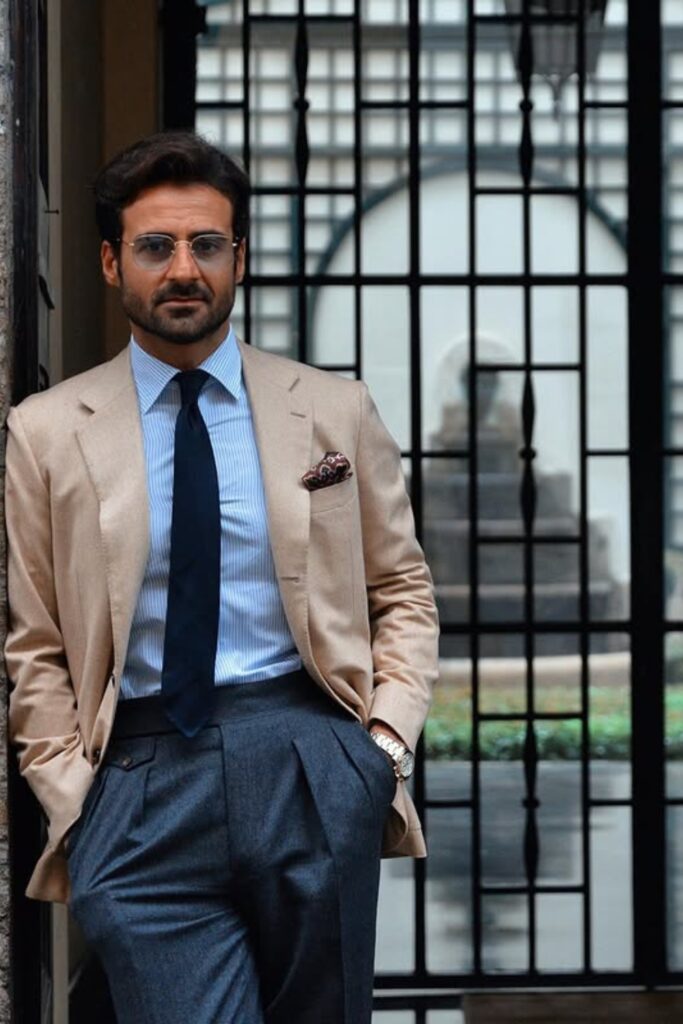 When various textures meet, tailored pieces often work best. A beige jacket over a striped shirt is a quick way to provide an exquisite contrast.