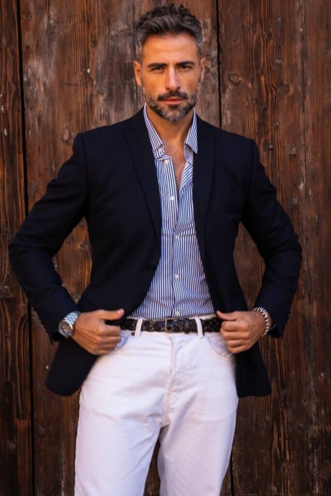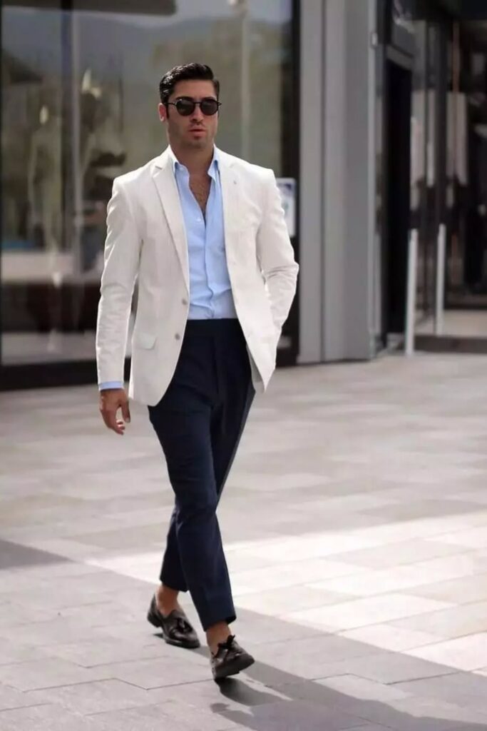 Bright tailoring looks great on vintage-inspired summer outfits, especially when you wear a white blazer with navy pants and an open-collared shirt.