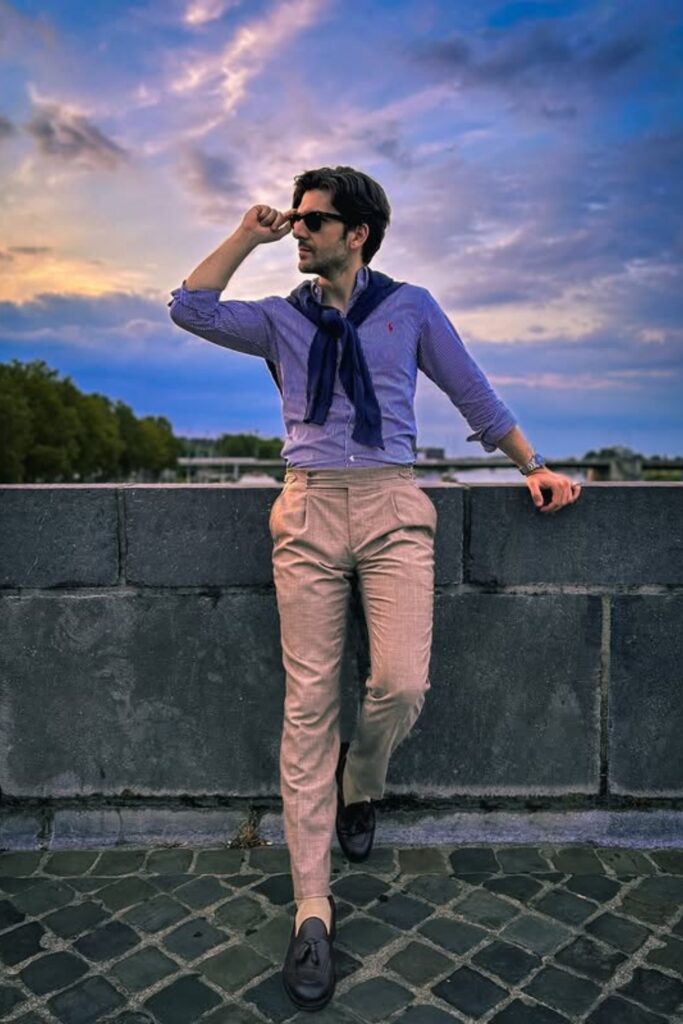 The tassel loafers complete the look, and the sunglasses keep that classic European summer look that is commonly seen in old photos of men’s clothing.