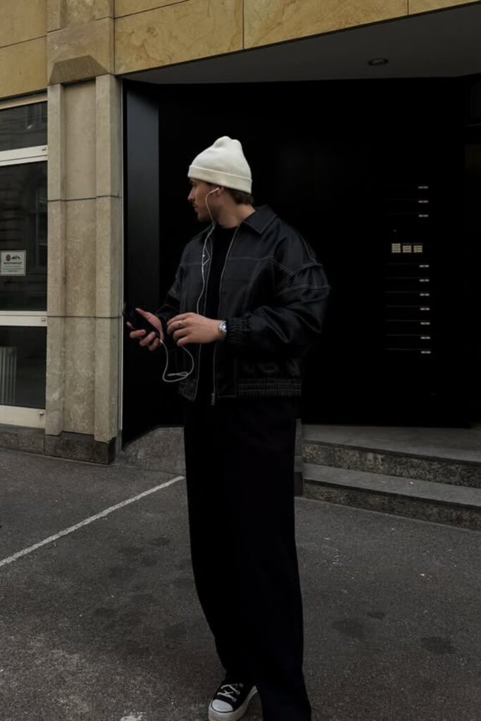 Street vintage frequently starts with simple layers. A dark leather jacket adds that rebellious vibe that was so popular in classic 80s city style.
